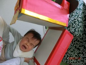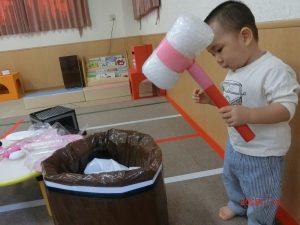 といっても本物のお餅ではなくダンボールやビニールなど様々な素材で作られた手作りオモチャのお餅つきセットです。