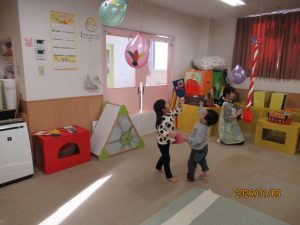 天井からぶら下がった風船の羽を、手作りの羽子板で打って遊びます。